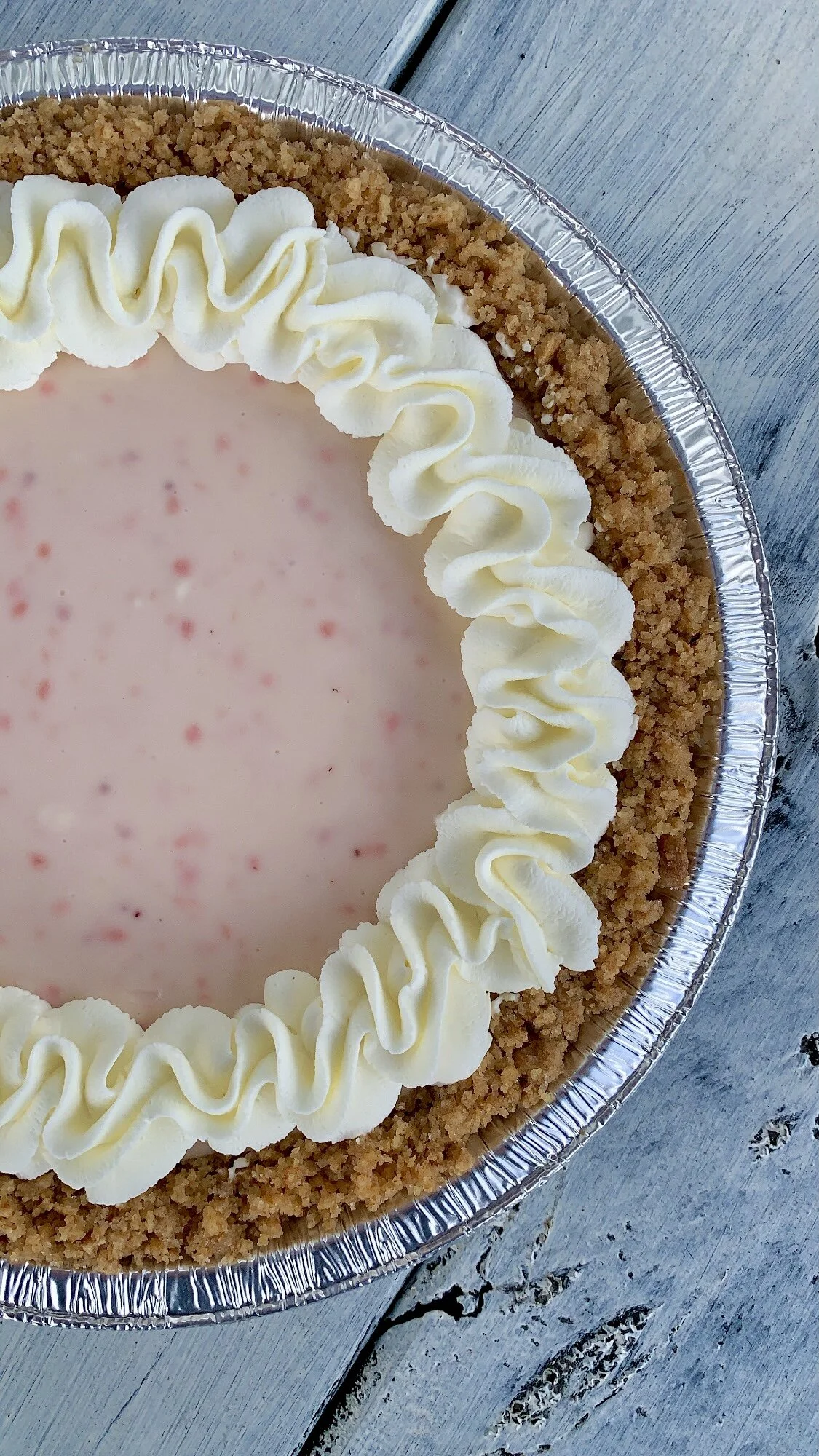 Our delicious strawberry key lime pie topped with a thin layer of chocolate ganache and whipped cream.